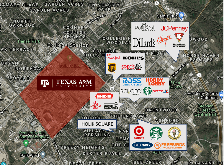This area map gives you an idea of what is conveniently located nearby. All kinds of shopping. Campus is less than 1 mile away. Two parks are about a block away. The TAMU shuttle picks up nearby. Great location!